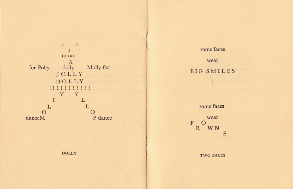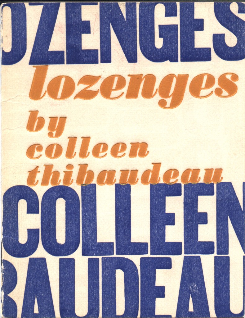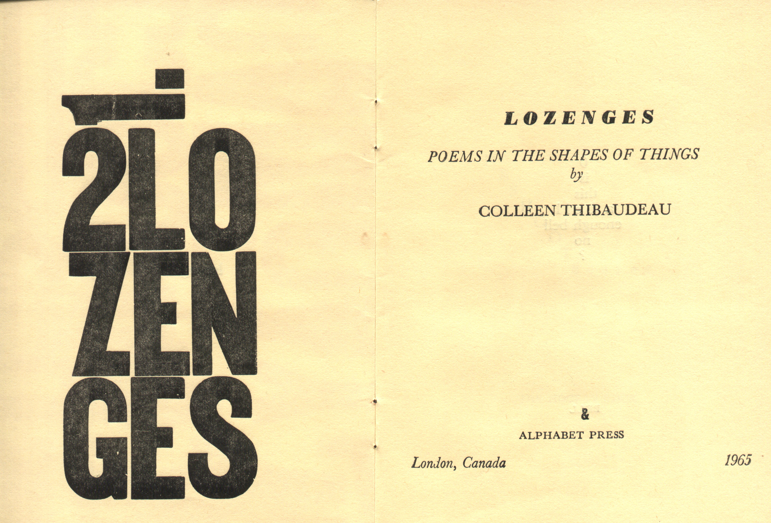Colleen’s book of concrete poems, Lozenges: Poems in the Shapes of Things, was published in 1965 by Alphabet Press in London, Ontario. Her husband James Reaney (1926-2008) typeset the poems and also designed the cover.