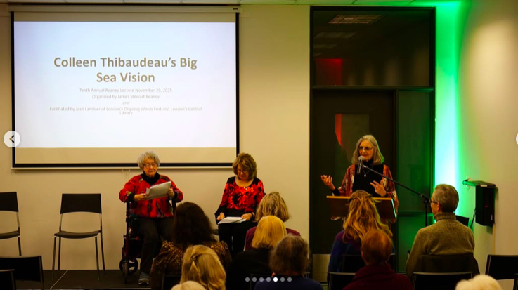 Thank you for coming to the 16th annual James Reaney Memorial Lecture celebrating poet Colleen Thibaudeau’s ‘Big Sea’ Vision on Saturday November 29th. This year’s lecture is part of Colleening 2025, a year-long celebration of Colleen Thibaudeau’s centenary.