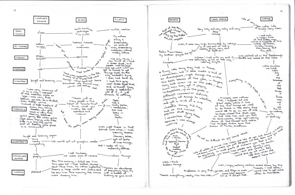 The patchwork chart at the end [pages 12 and 13] is the result of a “memory game”. We went through the places where Thibaudeau has lived (the left-hand column, on the chart) and she snapped out quick reactions to the various categories.