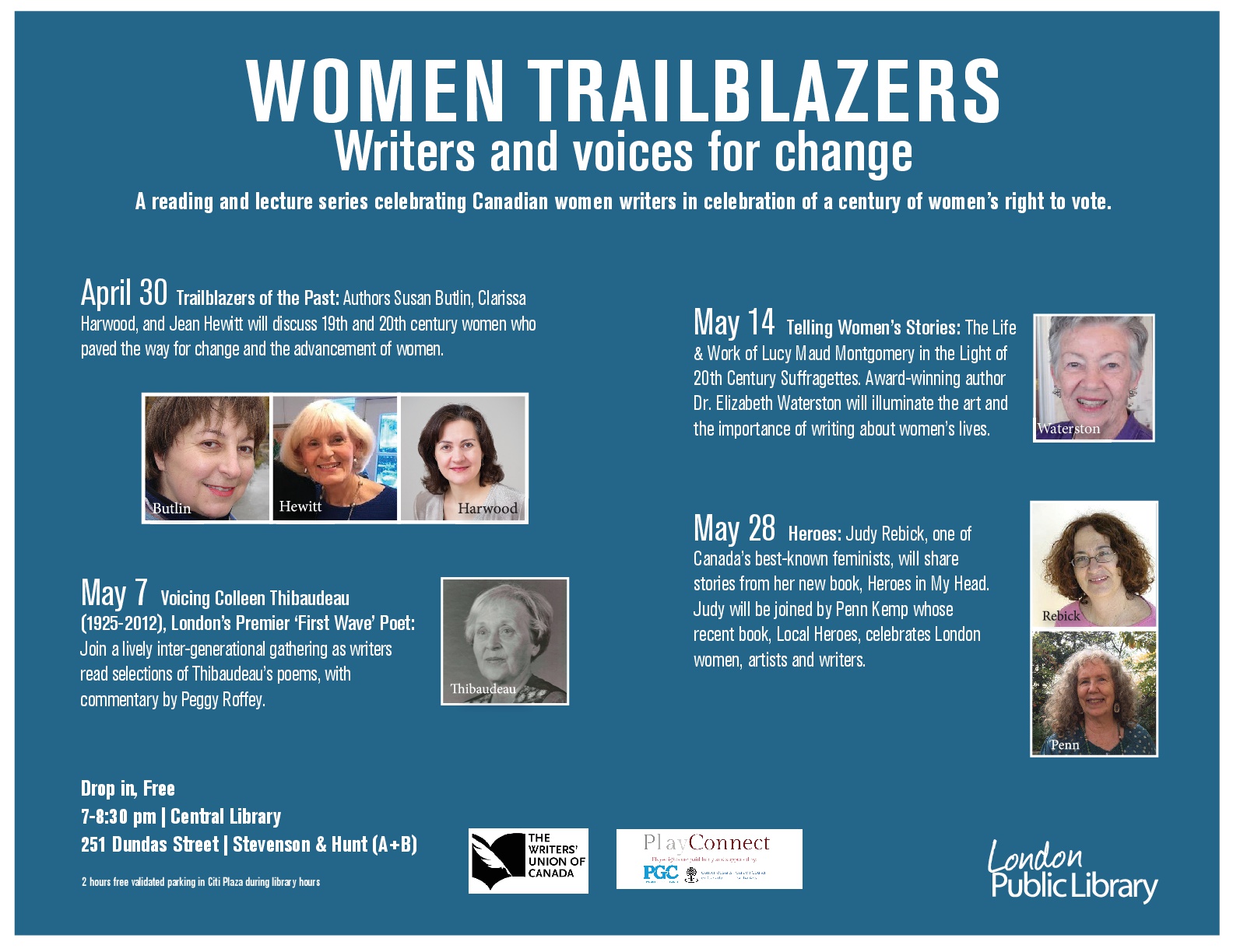 Special thanks to the London Public Library and Carolyn Doyle for including Colleen Thibaudeau in the “Women Trailblazers” series celebrating Canadian women writers. The series concludes on Monday May 28 at 7 pm with Judy Rebick and Penn Kemp reading from their new books.
